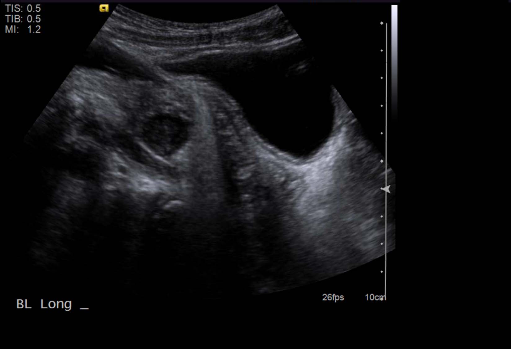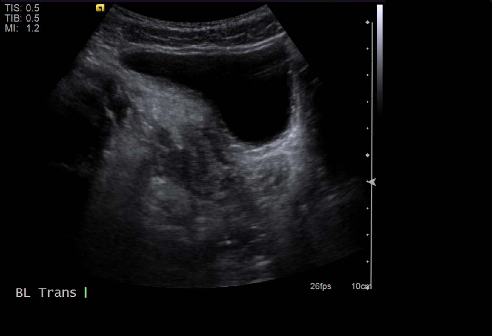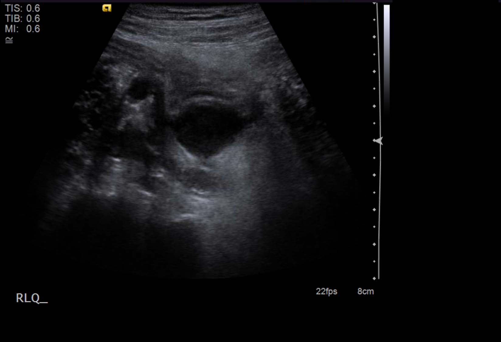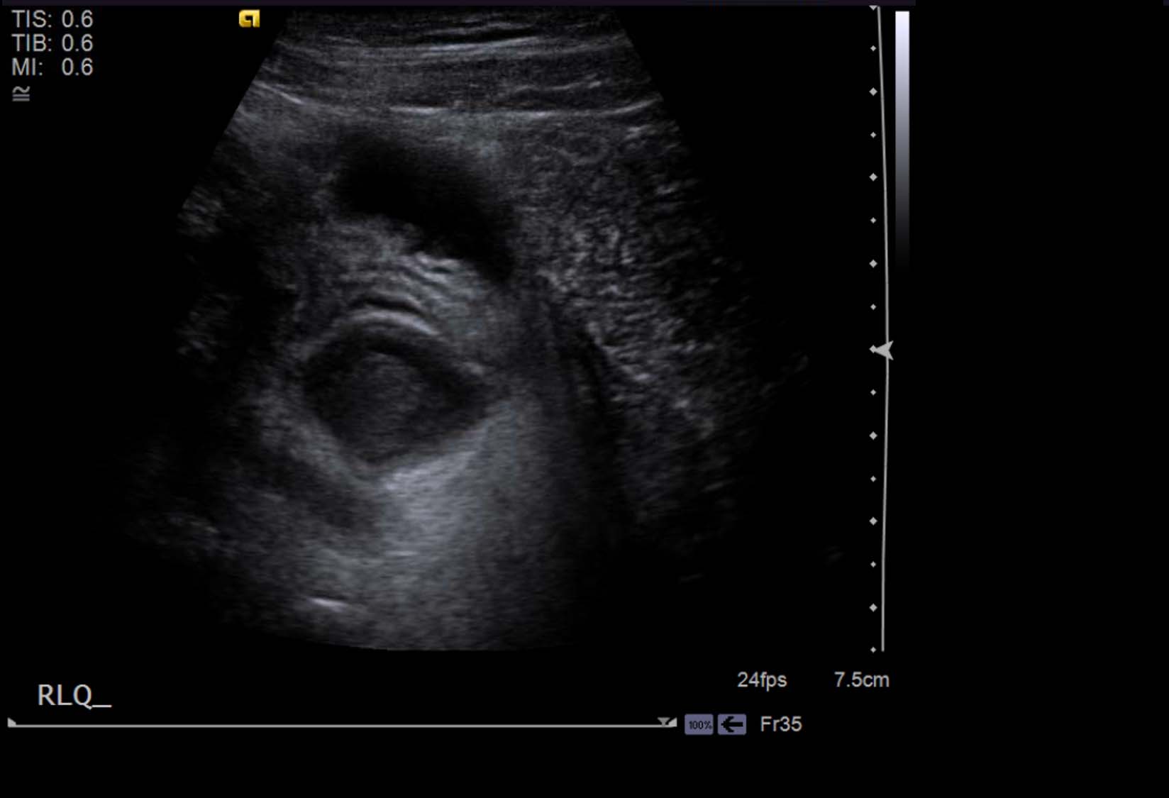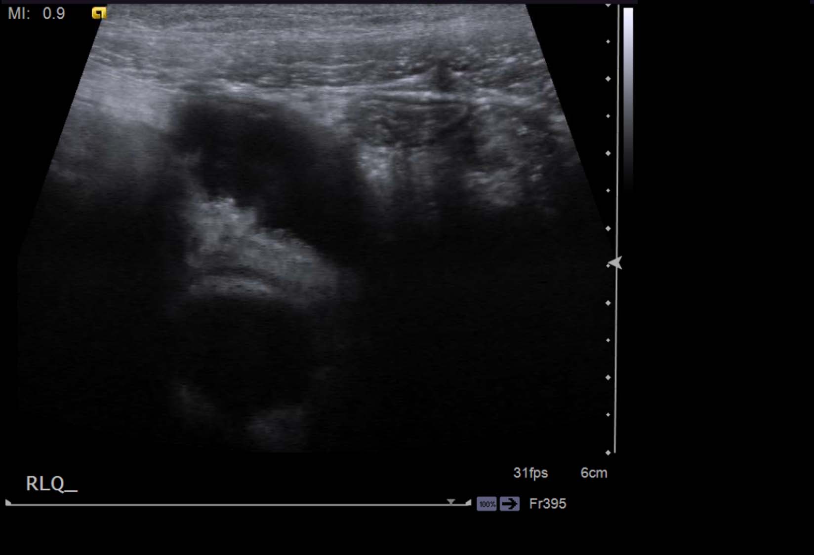 • Superficial to this is a 2 x 2.5 cm ovoid hypoechoic structure which appears separate from the adjacent bowel and shows no internal vascularity