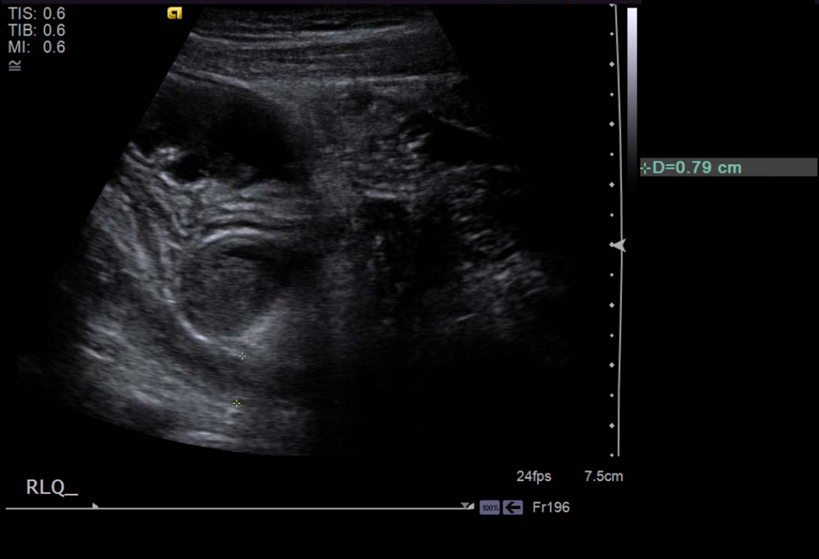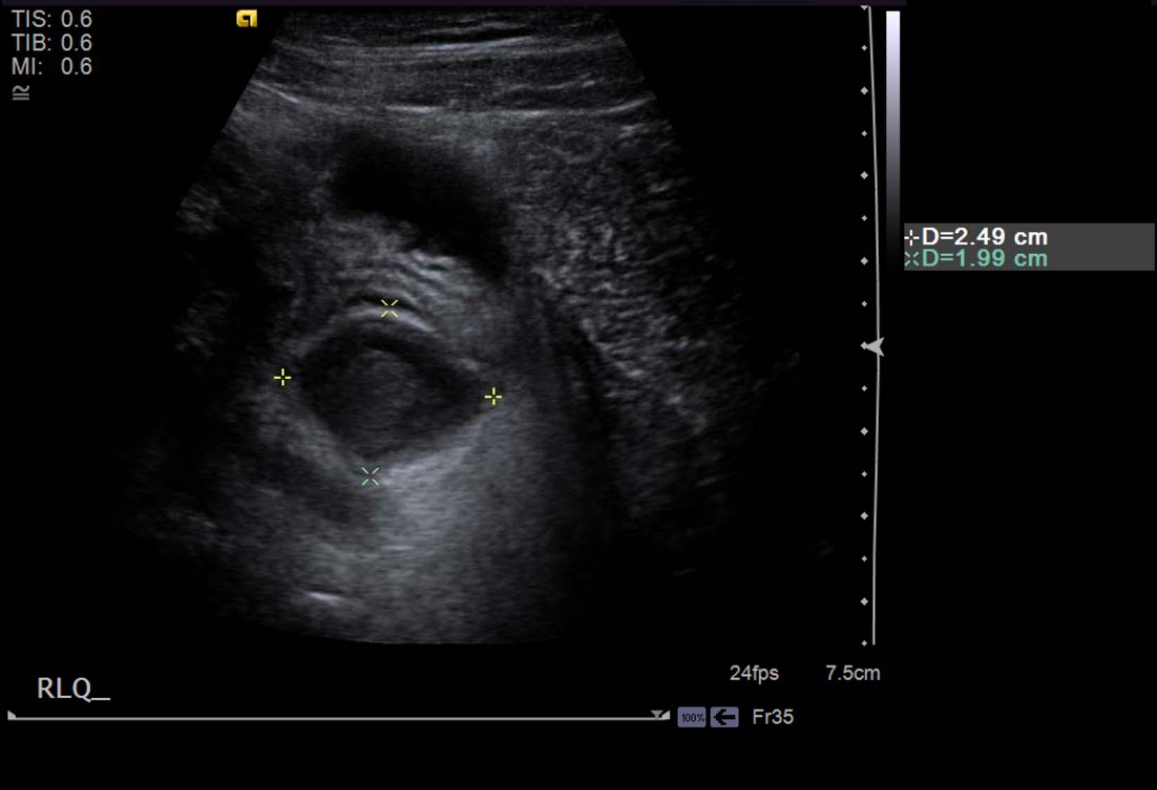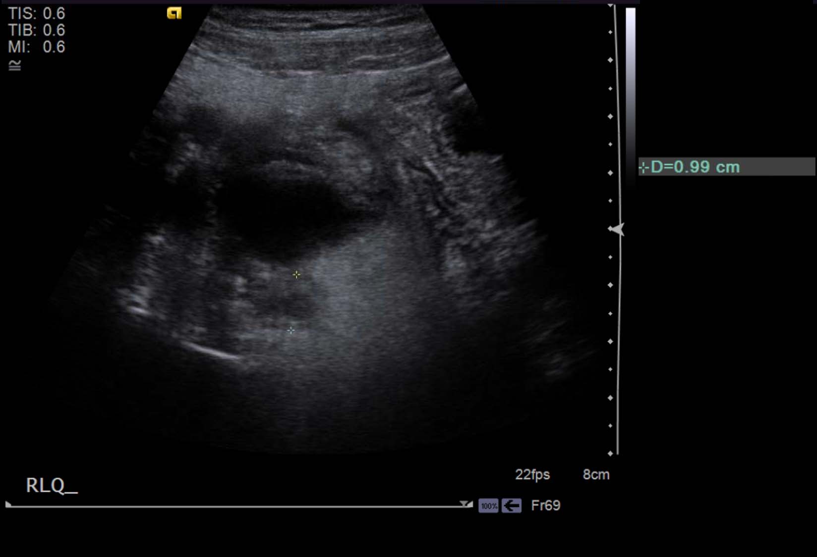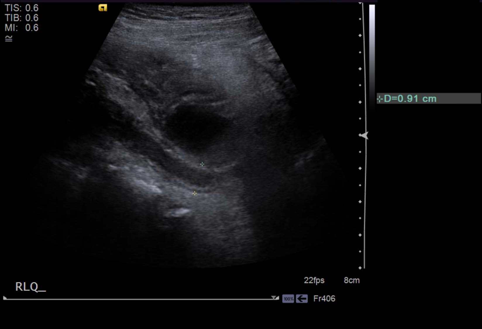 • Tubular, blind-ending structure in the right lower quadrant measuring 9 mm in diameter, which is noncompressible with mild wall thickening and mild mural hyperemia