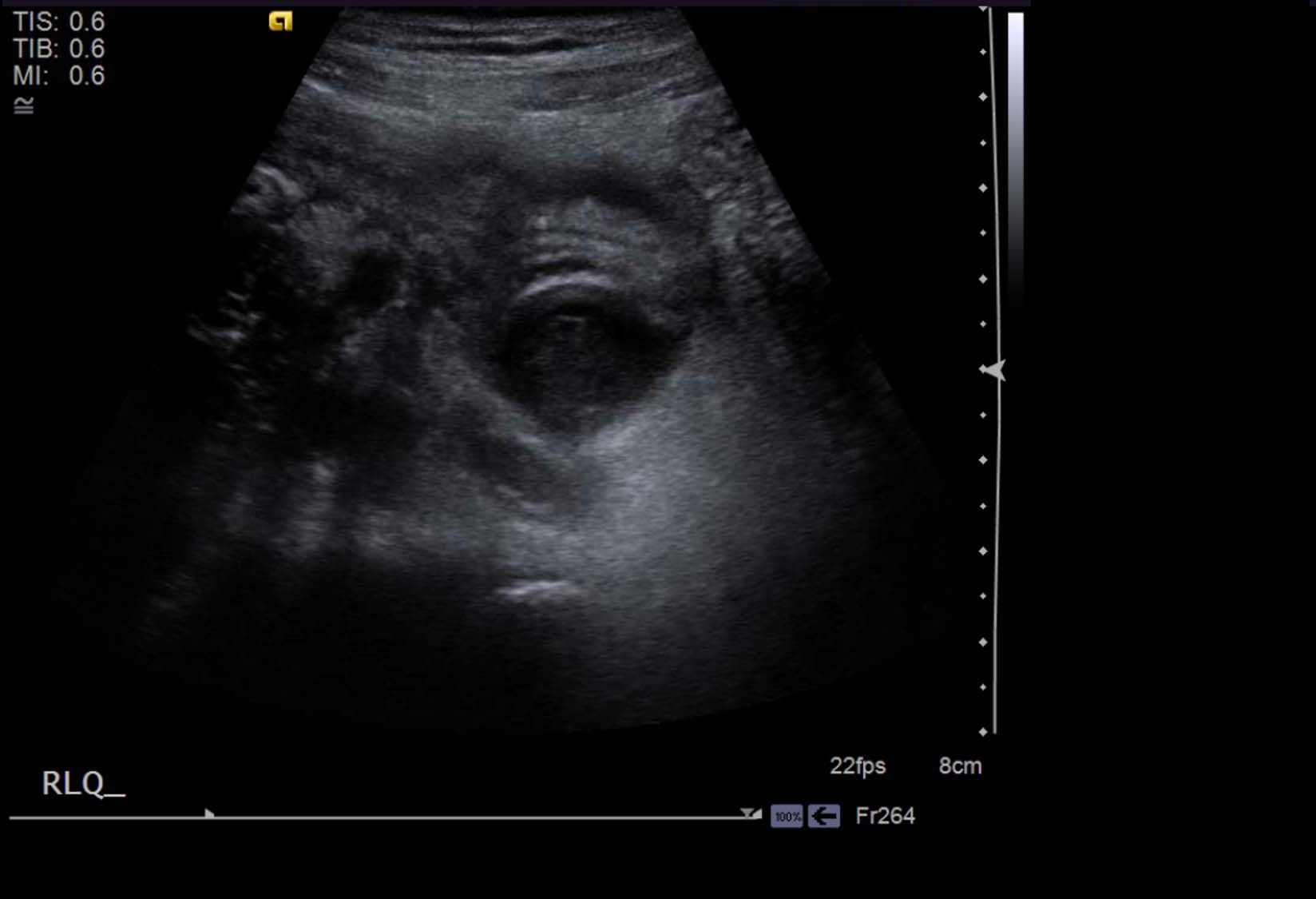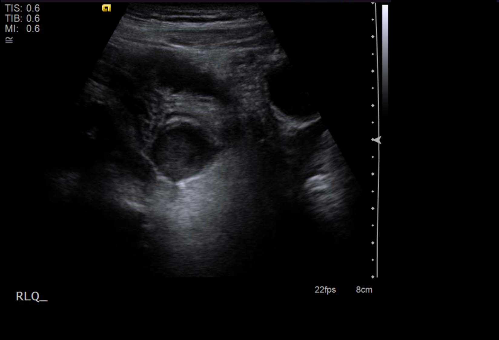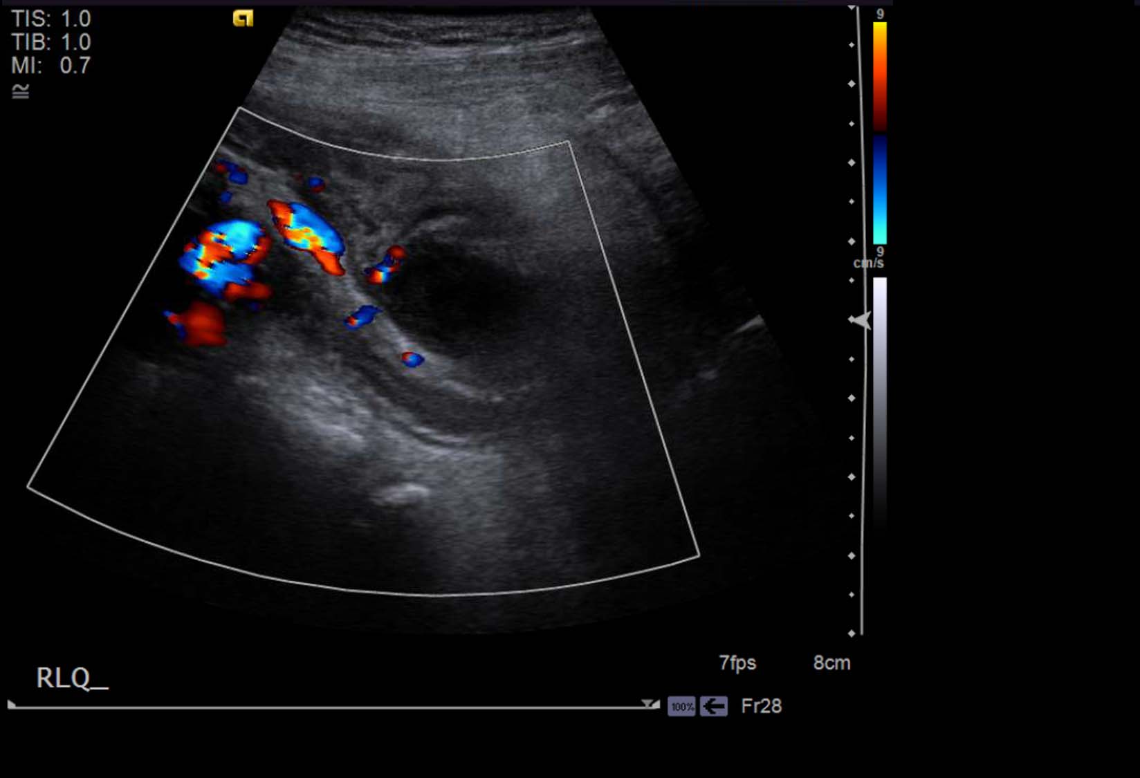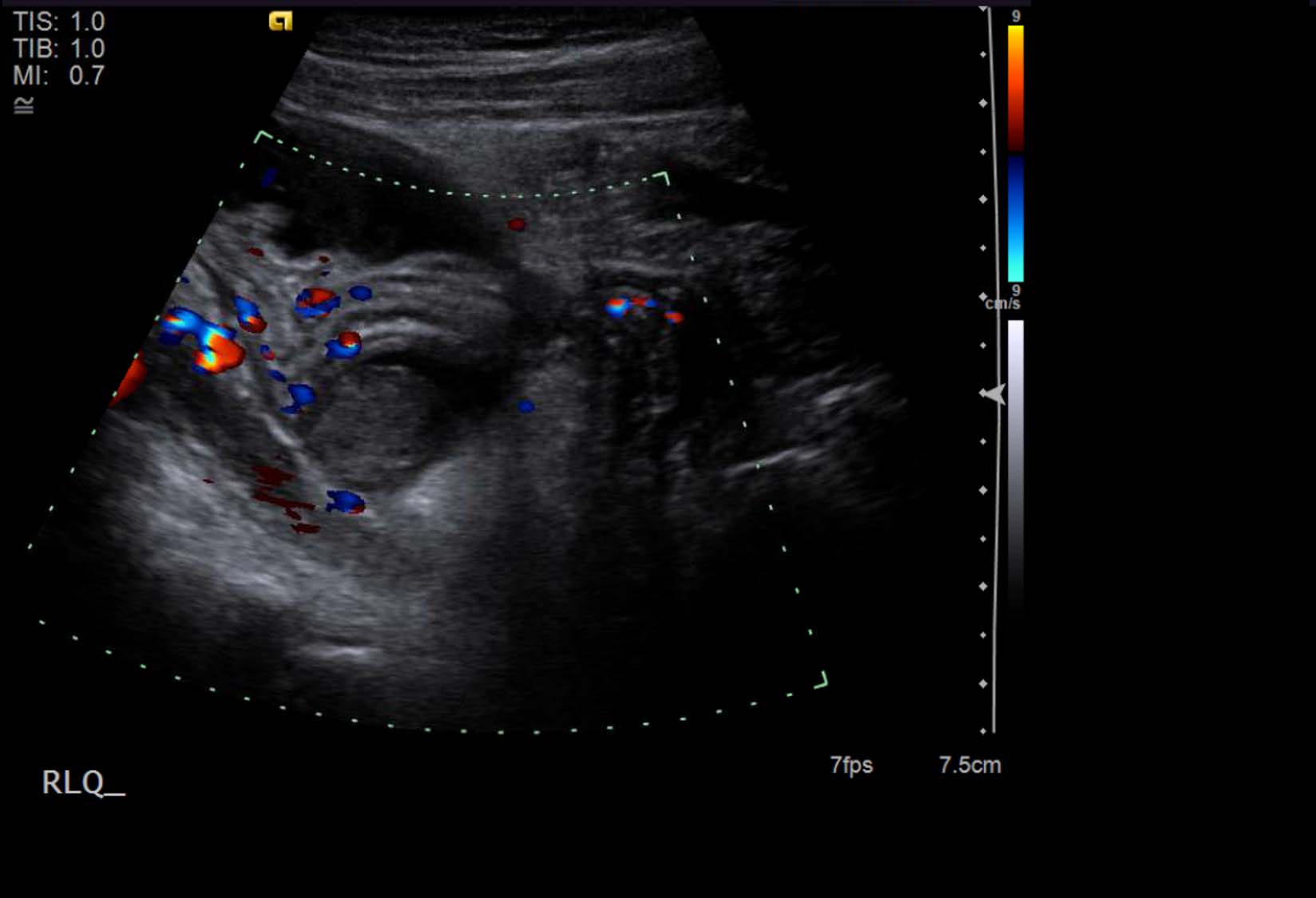 • Tubular, blind-ending structure in the right lower quadrant measuring 9 mm in diameter, which is noncompressible with mild wall thickening and mild mural hyperemia