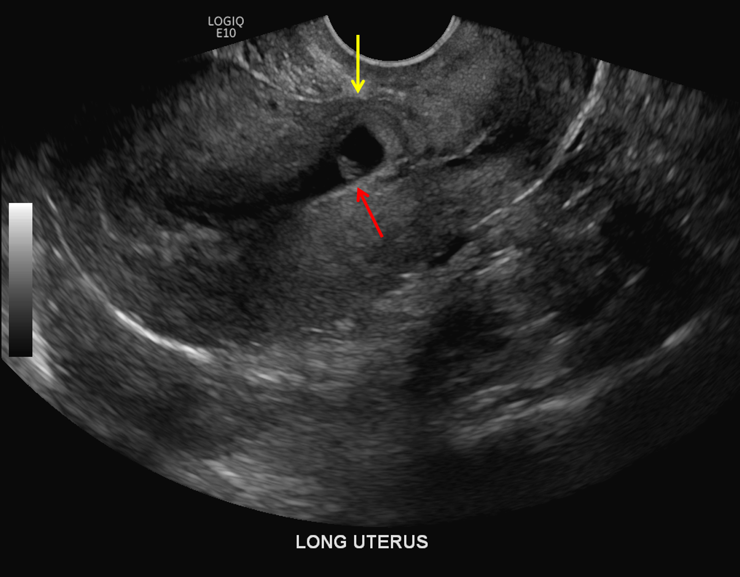 Gestational sac located within the C-section scar in the anterior wall of the lower uterine segment (red arrow) with overlying mural thinning (yellow arrow).