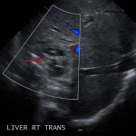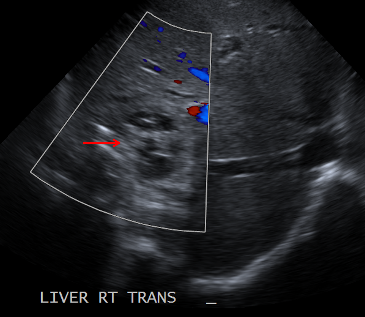 • Complex lesion in the right hepatic lobe measuring 5.2 x 4.5 x 4.2 cm with a hyperechoic rim, multiple rounded internal hypoechoic areas, and no internal Doppler flow