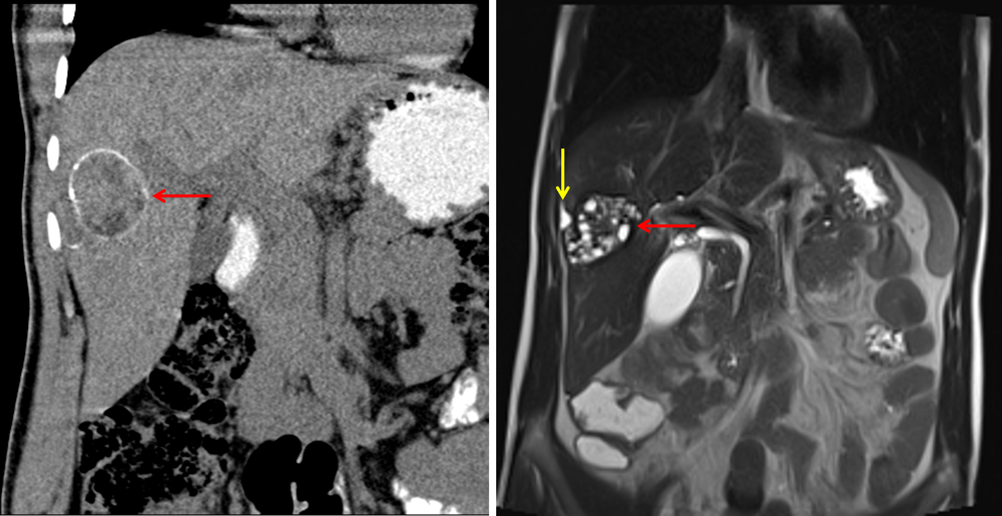 Complex structure in the right hepatic lobe with a thick, echogenic rim, internal hypoechoic areas, and no internal vascularity (red arrow). Noncontrast CT (on left) and T2-weighted MRI (on right) show a complex lesion in the right hepatic lobe (red arrows) with peripheral calcification best seen on CT and internal cystic areas best seen on MRI. Small volume adjacent perihepatic free fluid (yellow arrow).