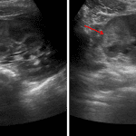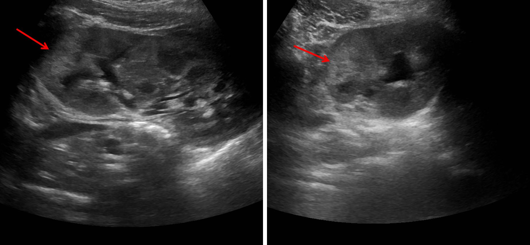 Wedge-shaped areas of parenchymal hyperechogenicity in the right kidney (red arrows), concerning for pyelonephritis.