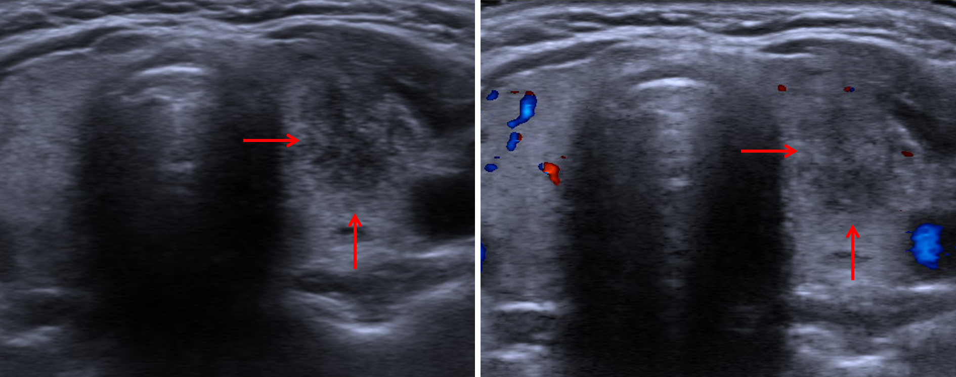 Sample ReportIll-defined nodule in the left thyroid lobe measuring up to 2.2 cm with decreased internal vascularity in addition to multiple additional subcentimeter nodules, which are favored to relate to subacute thyroiditis in this patient presenting with neck tenderness. Recommend followup ultrasound in 4-6 weeks to assess for improvement in findings.
