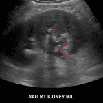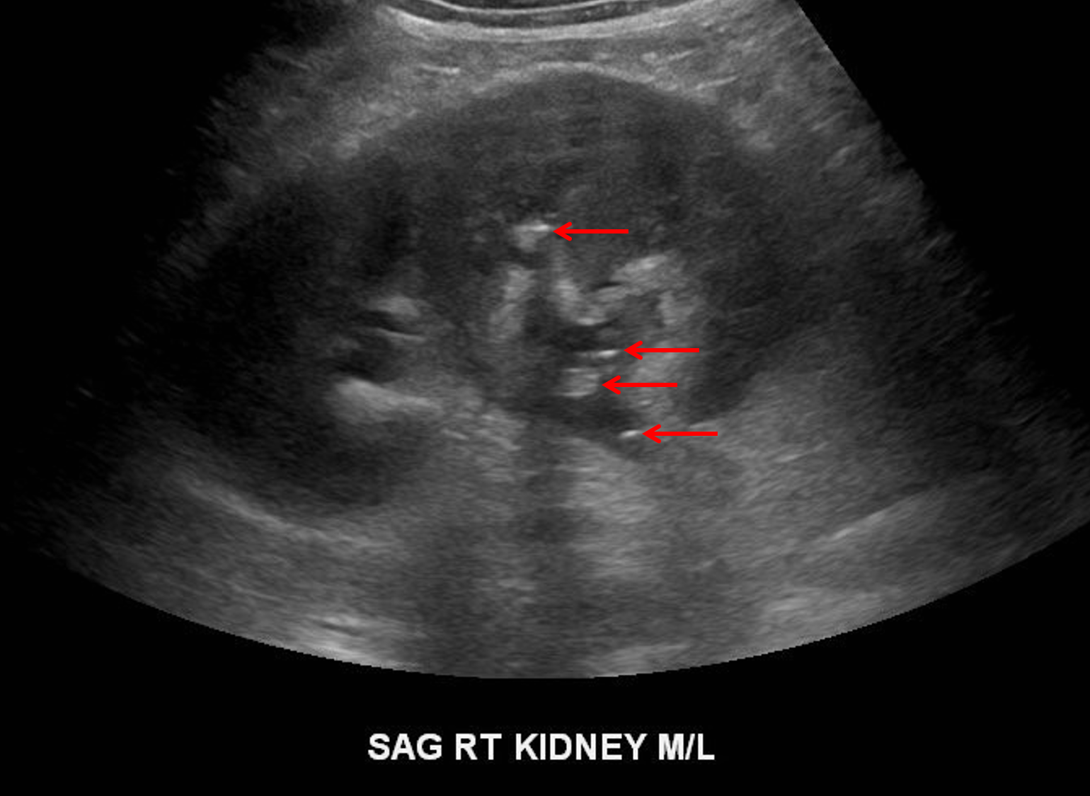 • Mild right hydronephrosis with multiple echogenic foci in the right renal collecting system, some of which demonstrate ill-defined posterior acoustic shadowing