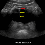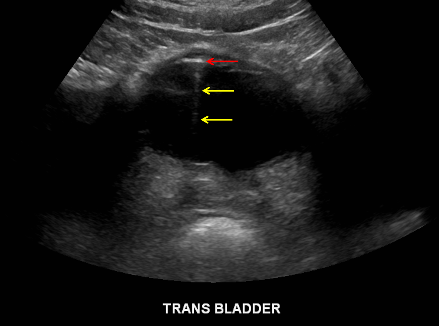 • Antidependent echogenic material in the urinary bladder with associated ring-down artifact