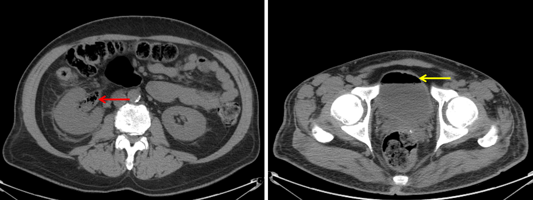 Multiple echogenic structures in the right renal collecting system (red arrows), concerning for gas. Echogenic structure near the anterior wall of the bladder (red arrow) with ring-down artifact (yellow arrows), which is a typical appearance for gas near or within the bladder wall. Followup noncontrast CT in this patient confirms right renal collecting system gas (red arrow) and gas in the urinary bladder (yellow arrow).