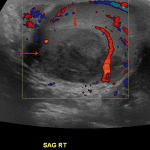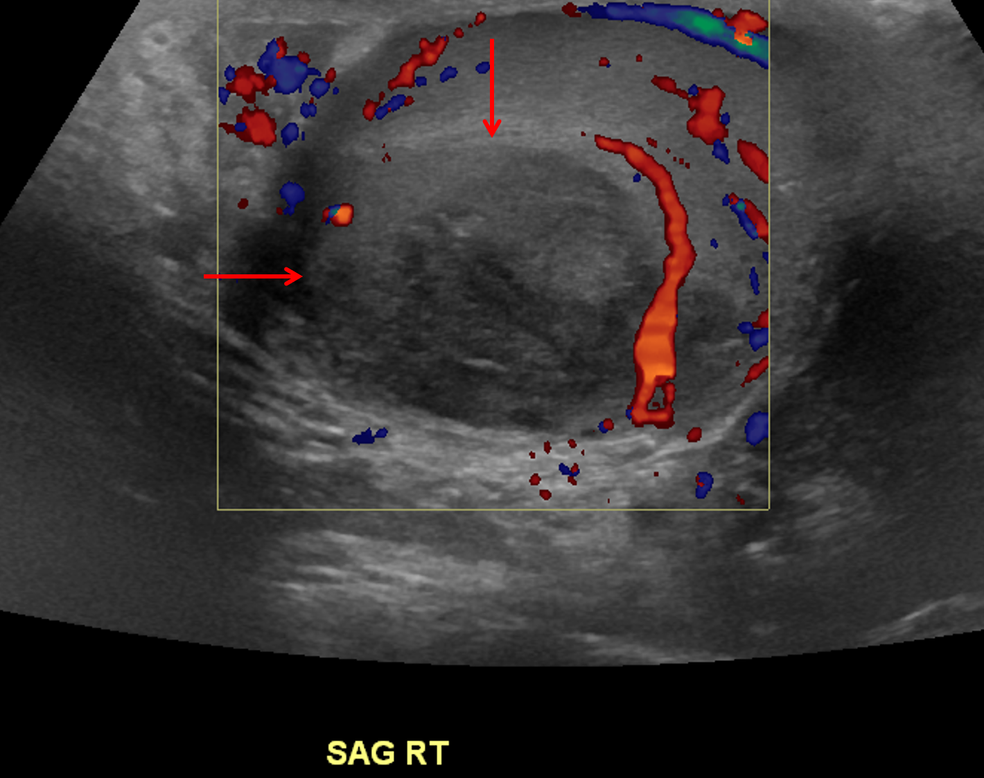 Rounded hypoechoic structure in the right testis measuring 2.8 x 2.7 x 2.1 cm without internal vascularity, which may represent a developing abscess, hypovascular or centrally necrotic testicular neoplasm, granulomatous disease, or segmental testicular infarct. Recommend urology consultation and followup imaging with ultrasound or MRI following treatment for further assessment.