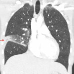 Sample ReportRight middle lobe pneumonia. Additional scattered groundglass opacities in the right lower lobe and lingula are likely also infectious in etiology.
