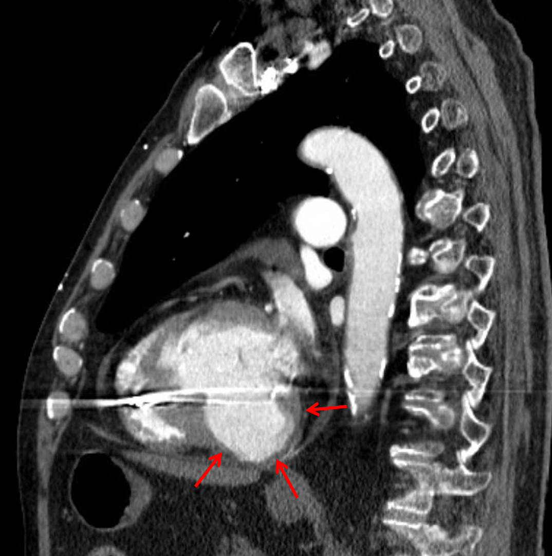 Outpouching arising from the inferior wall of the left ventricle most suggestive of a false aneurysm (pseudoaneurysm).
