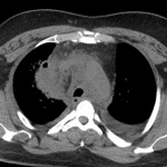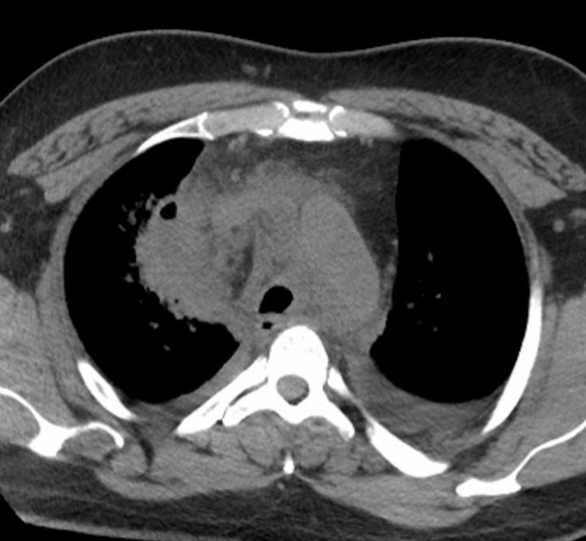 Sample ReportFindings concerning for a right upper lobe pulmonary abscess with adjacent mediastinitis. No mediastinal gas or drainable mediastinal fluid collection. Recommend followup imaging after treatment to ensure resolution.