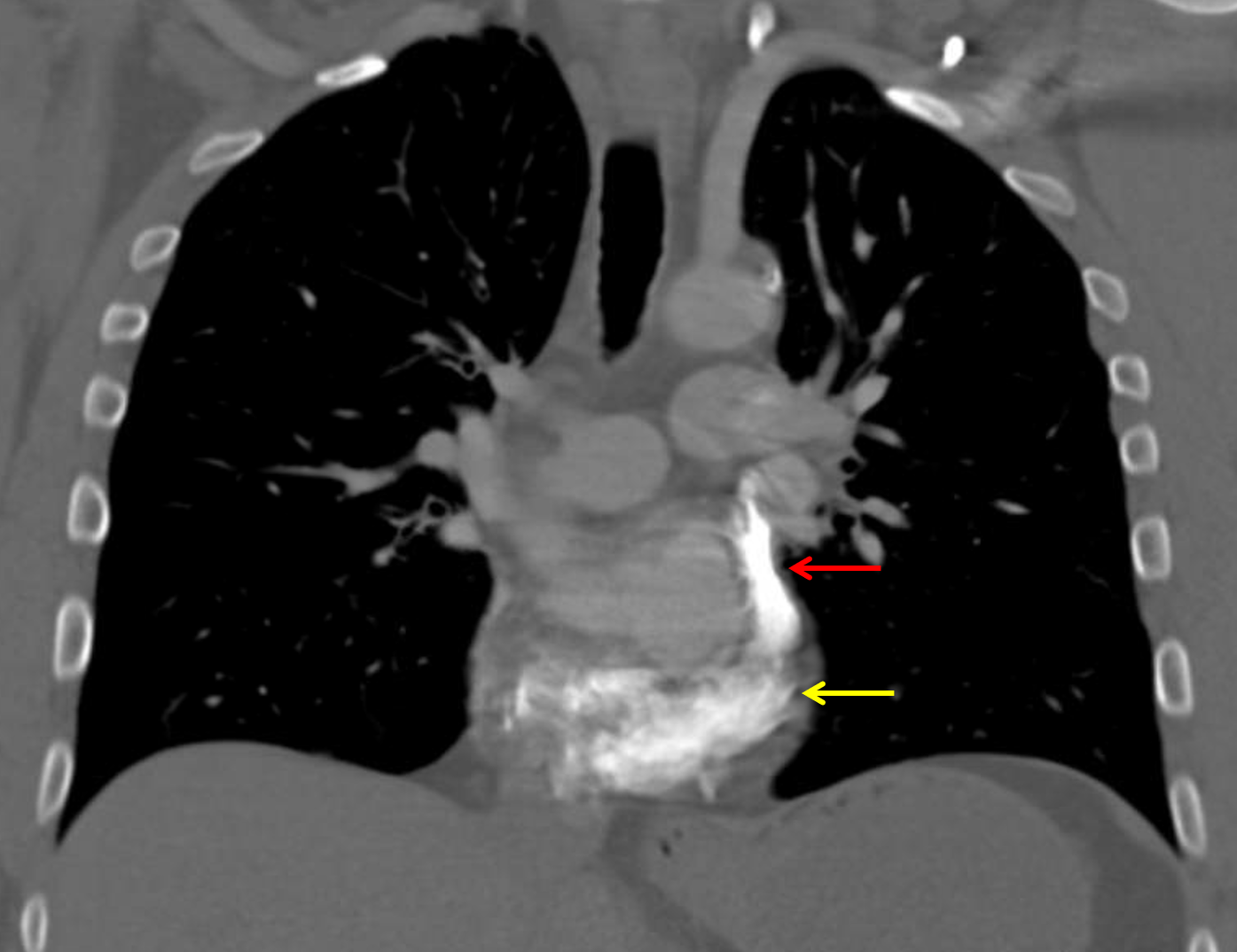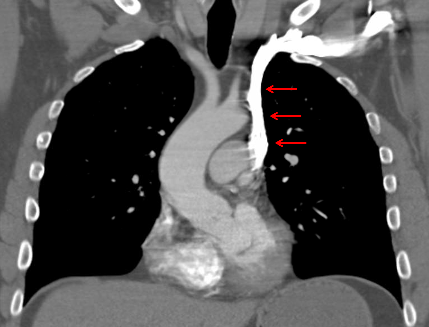Left SVC draining into the coronary sinus and absent right SVC, anatomic variant. This variant anatomy should be taken into consideration with any future central venous access.