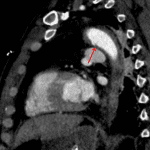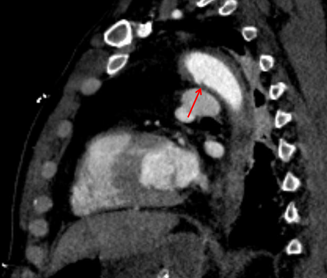 Sample ReportAortic intimal tear at the attachment of the ligamentum arteriosum with a small surrounding mediastinal hematoma and a small focal irregular bulge of the aortic external contour, which is consistent with a small pseudoaneurysm.