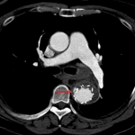 • Surgical changes of endograft repair of the distal aortic arch and descending thoracic aorta with aneurysmal dilation of the aorta measuring up to 4.5 x 4 cm transaxially in the proximal descending aorta