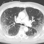 • Patchy airspace opacification in the periphery of both lungs with central sparing (reverse batwing pattern)
