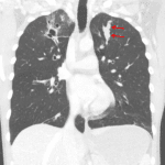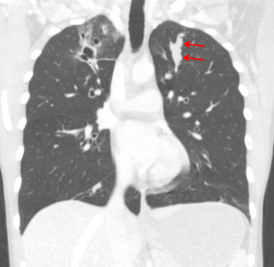 Red arrows: finger-in-glove appearance of mucous filling dilated bronchi on this patient's subsequent CT.