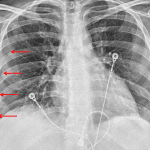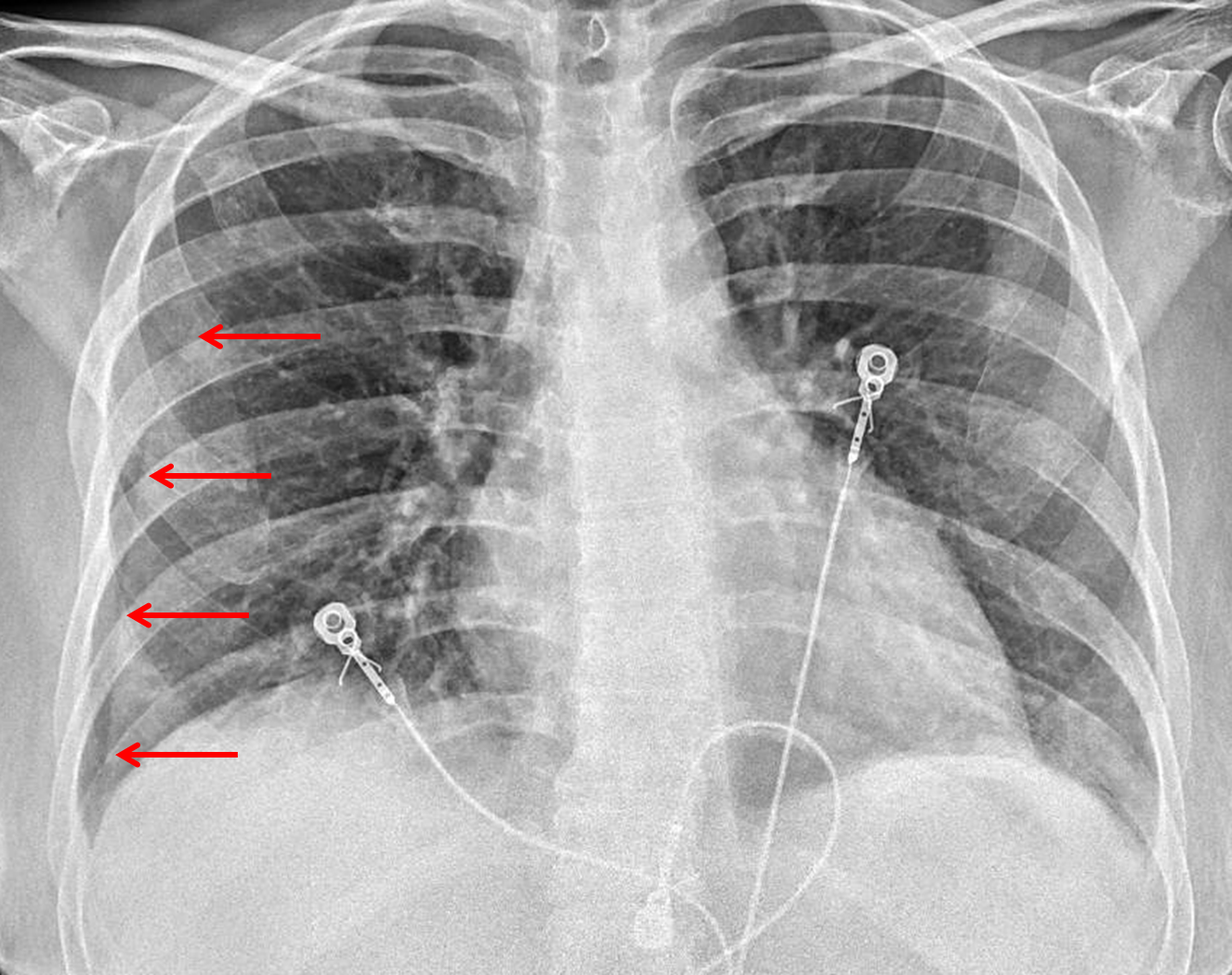 Vertically-oriented line traversing the lateral right lung field likely represents a skin fold. Repeat imaging could be considered if there is high clinical concern for pneumothorax.
