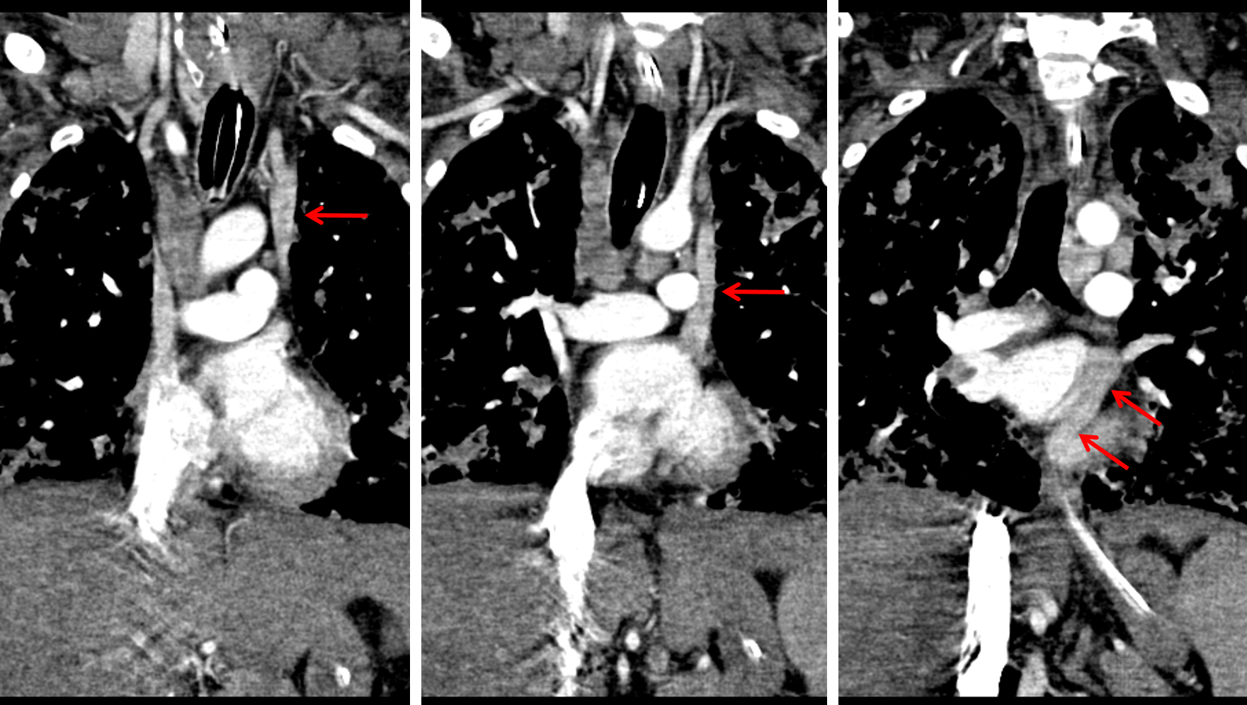 Sample ReportLeft upper extremity PICC courses inferiorly along the left aspect of the mediastinum, possibly within an anomalous venous structure such as a left SVC, though arterial placement is difficult to exclude on this single radiographic view. Recommend correlation with any available prior cross-sectional imaging and with blood gas sampling from the catheter.