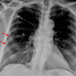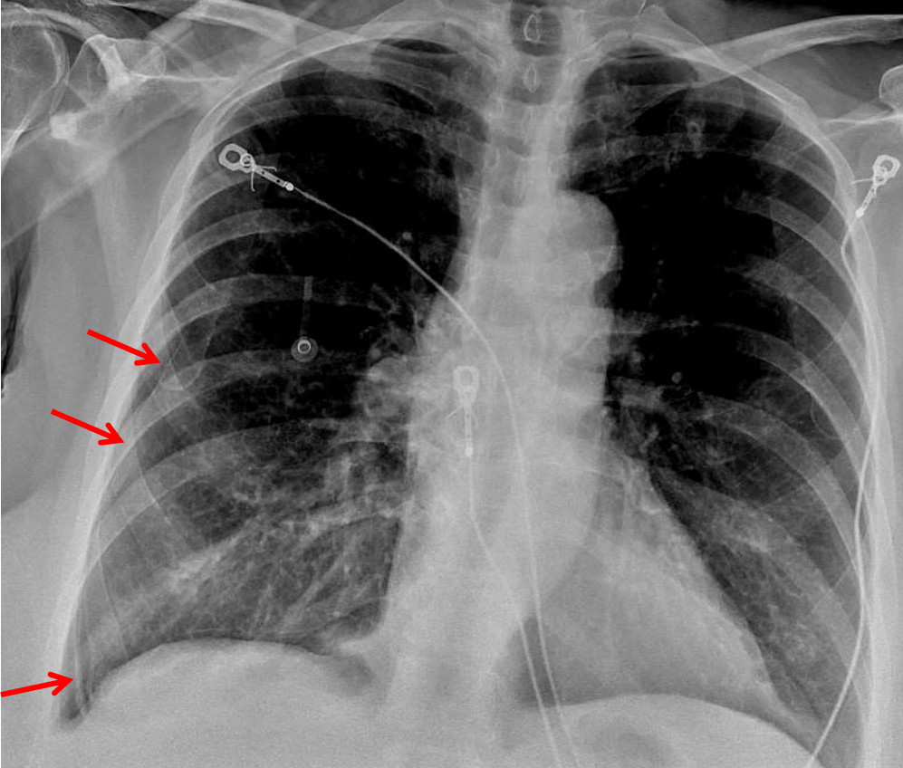 Irregular thin line along the lateral right hemithorax (red arrows) concerning for pneumothorax. Follow CT shows a multiloculated right pneumothorax.