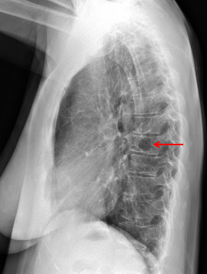 Sample ReportLucency projecting over a midthoracic vertebral body on the lateral projection. Consider T-spine MRI with and without contrast for further evaluation.