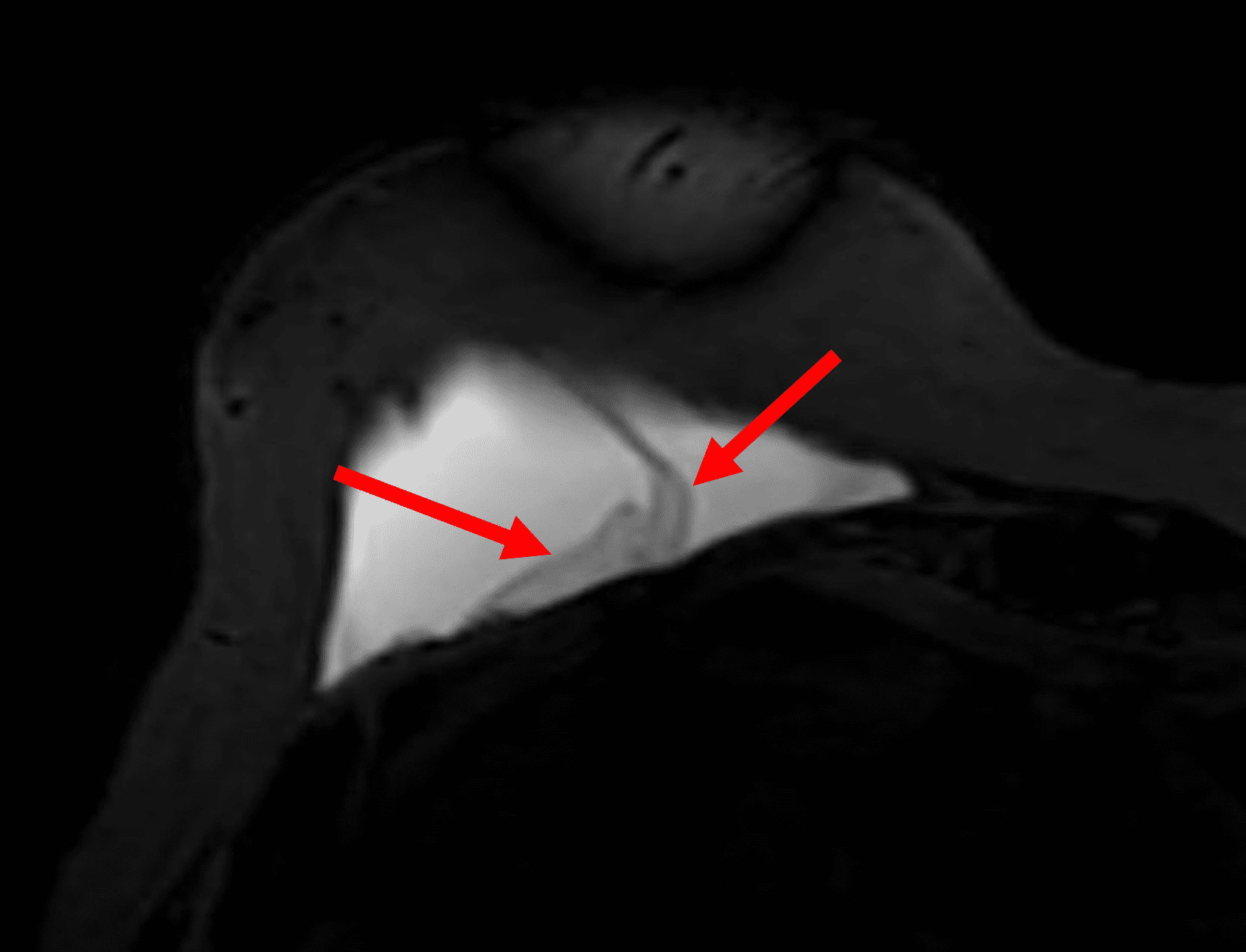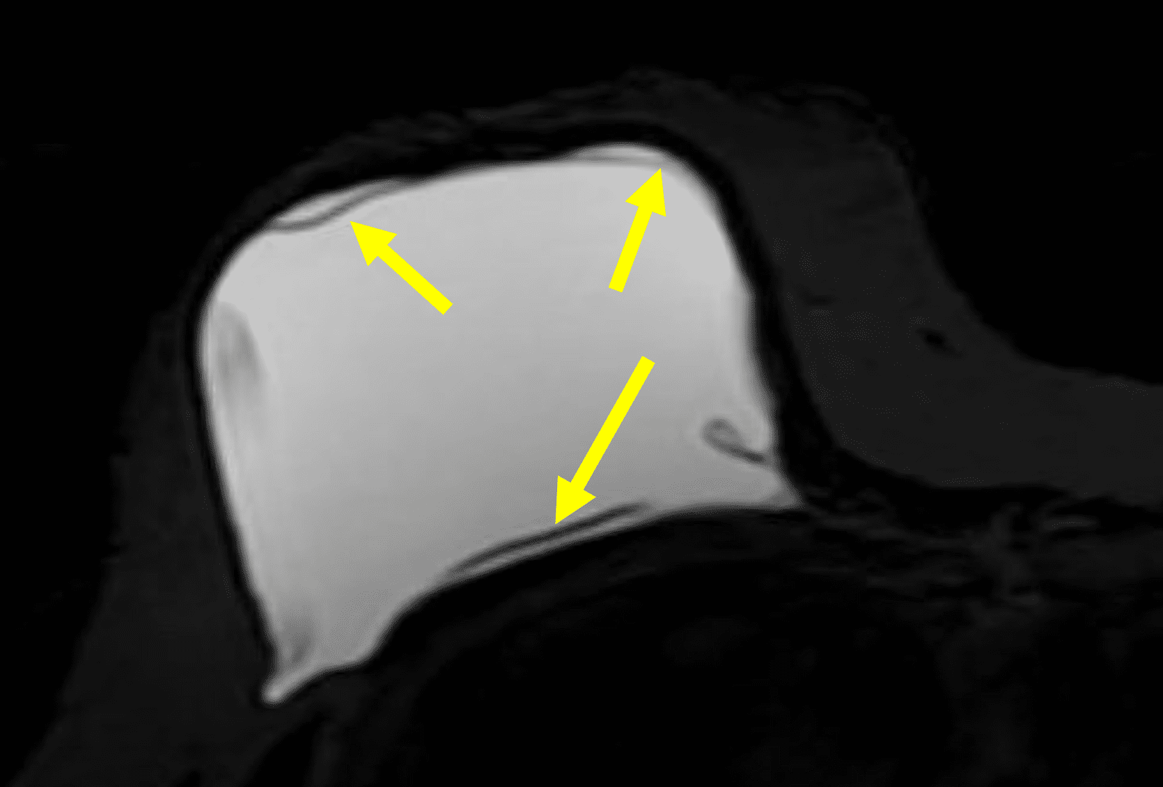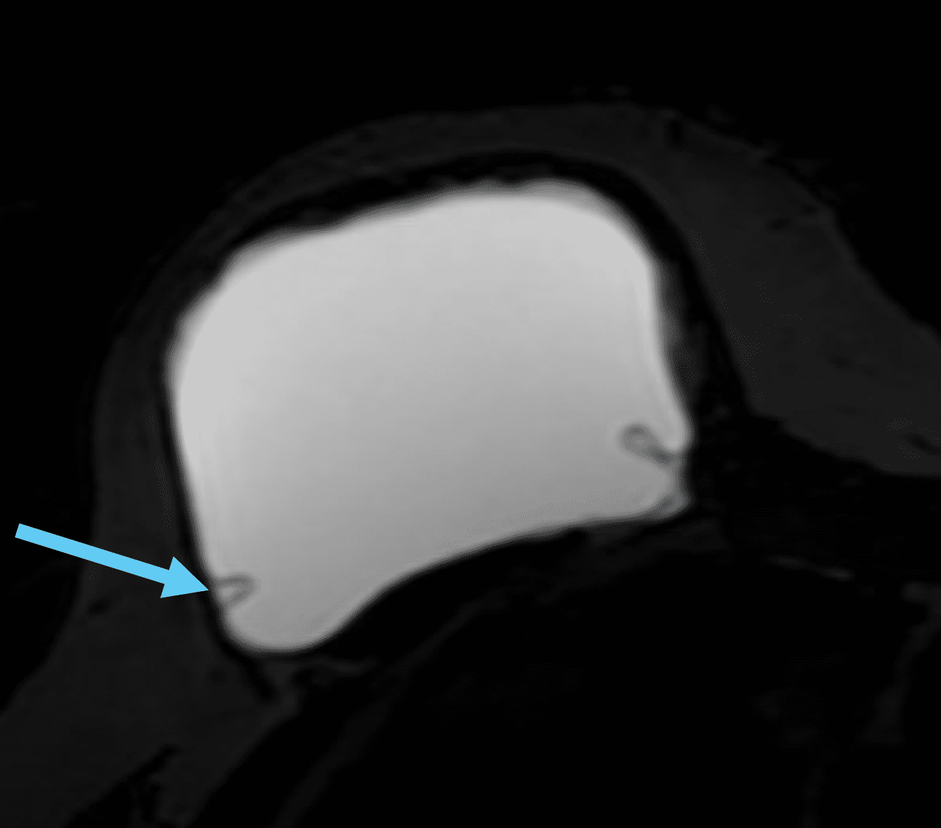 Sample ReportThere is evidence of bilateral mastectomies status post reconstruction with bilateral retropectoral silicone implants. There is no evidence of intracapsular or extracapsular rupture of the left implant. Evidence of intracapsular rupture of the right implant is seen, including the subcapsular line sign, keyhole sign, and linguini sign. No evidence of extracapsular rupture of the right implant. No mass or suspicious enhancement is seen in either reconstructed breast. No axillary or internal mammary adenopathy is identified.