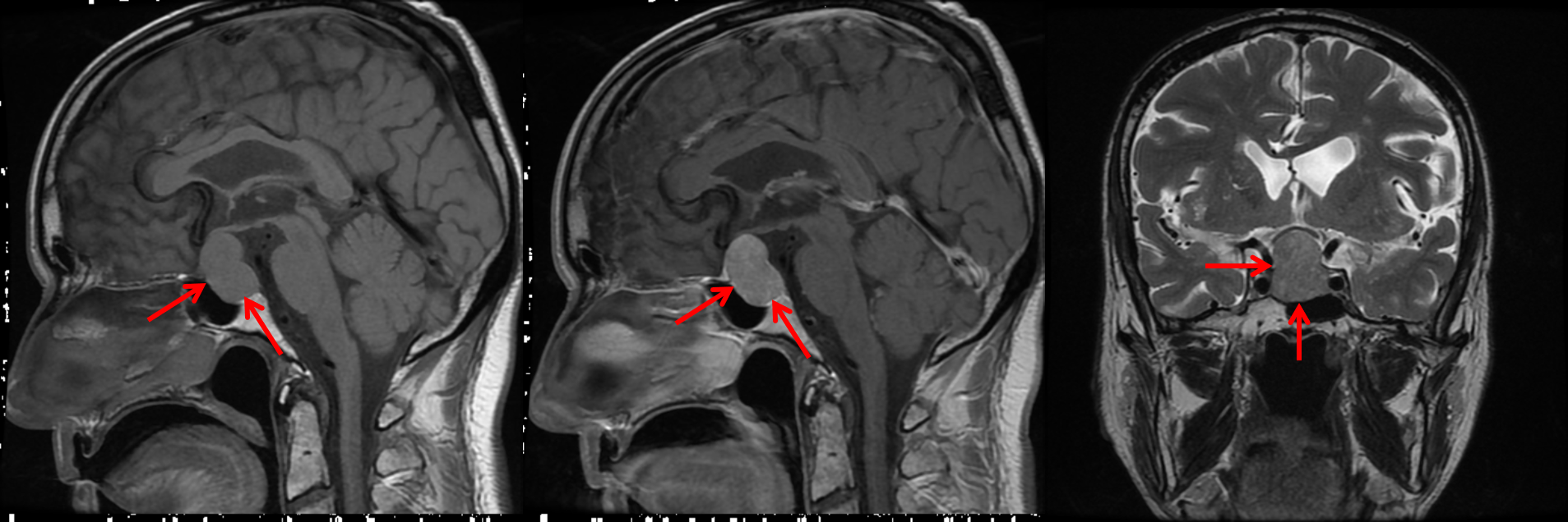 The location of the mass on each of the sequences is shown in the annotated image below. It is displacing one of the cranial nerves.