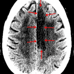 • Hypodensity and loss of gray-white differentiation involving the left paramedian frontal and parietal lobes