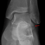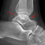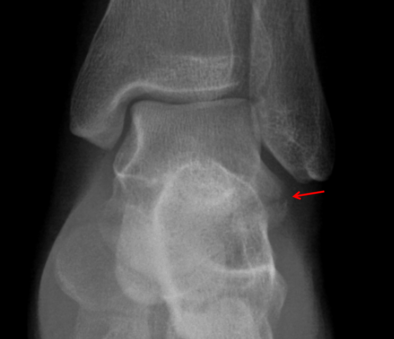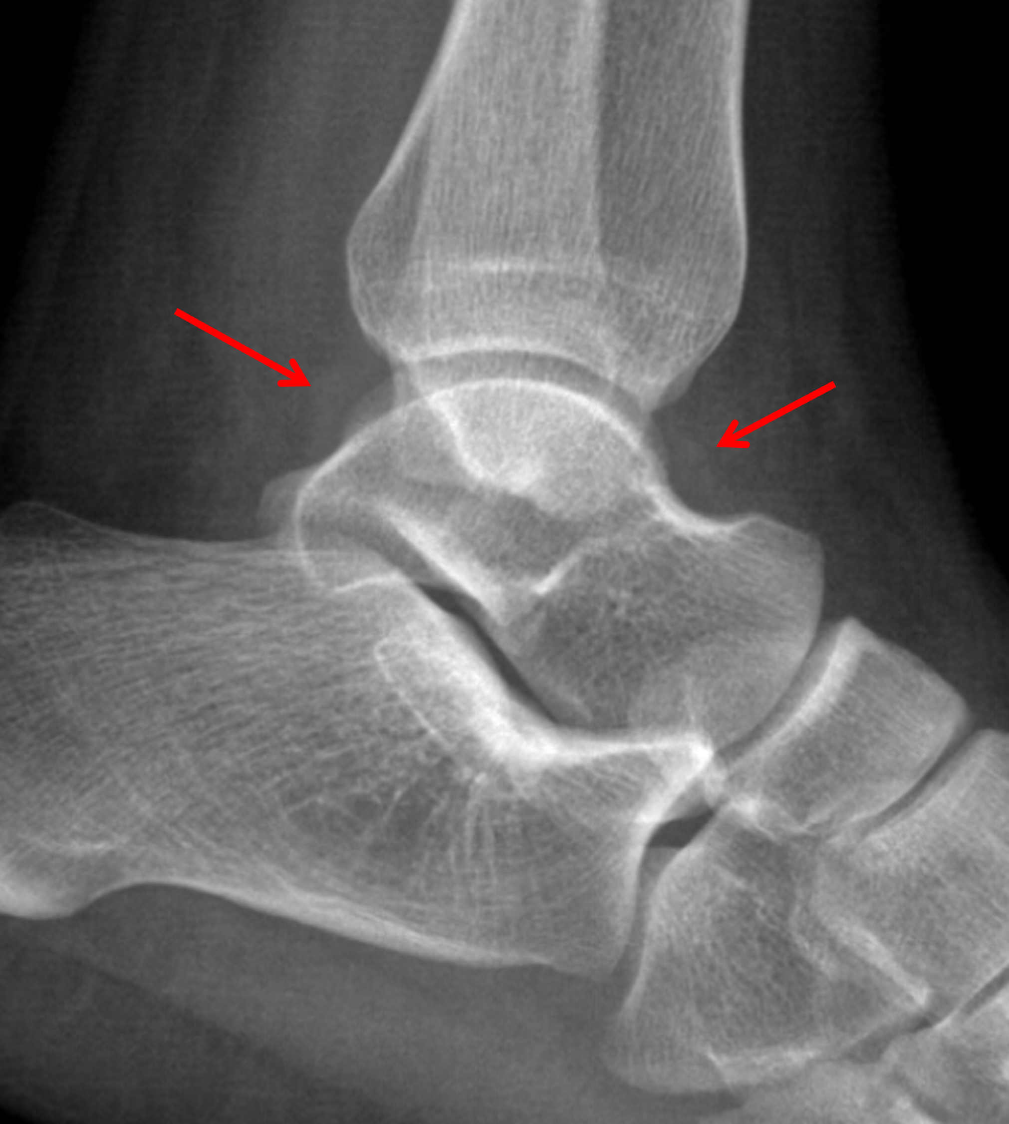 Red arrow: nondisplaced lateral process of talus fracture. Red arrows demonstrate subtle increased density anterior and posterior to the tibiotalar joint, suggesting the presence of an ankle joint effusion.