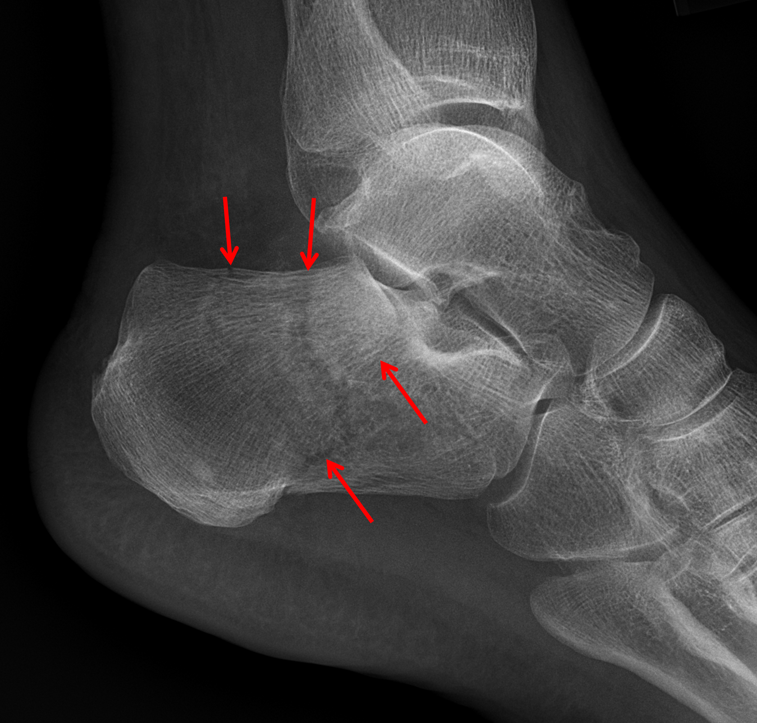 Sample ReportAcute mildly comminuted, nondepressed calcaneal fracture with intraarticular extension into the posterior subtalar joint. Overlying soft tissue swelling. Consider CT for further evaluation.