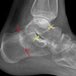 Linear sclerotic band extending through the talar neck with possible minimal cortical offset along the inferior margin (only seen on the lateral view), concerning for a talar neck stress fracture.