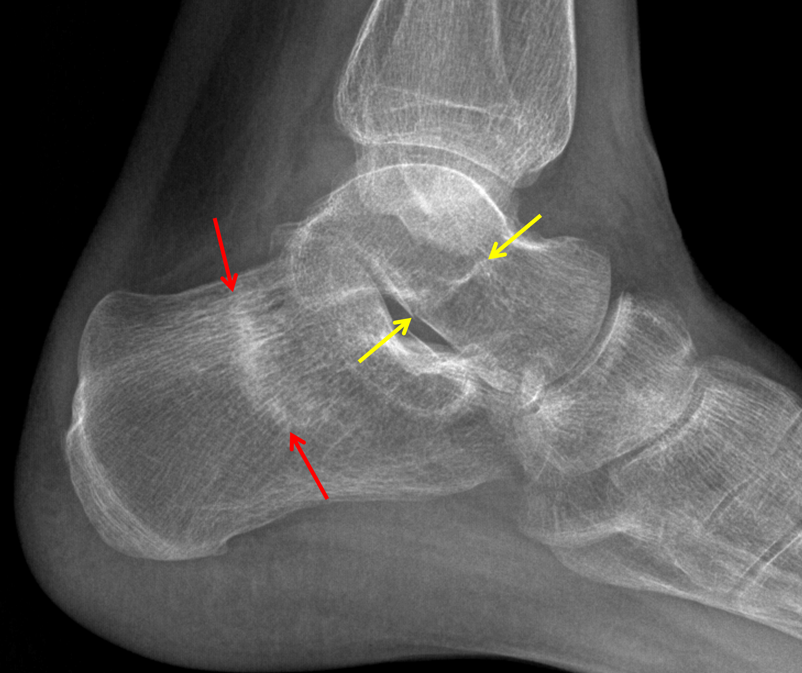 Linear band of sclerosis in the calcaneus concerning for calcaneal stress fracture.