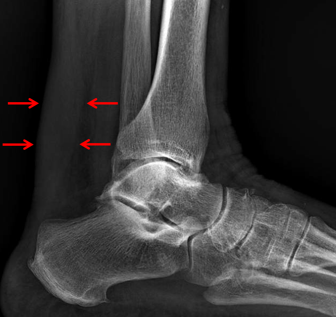 Thickening of the Achilles tendon suggestive of Achilles tendinitis or tear.
