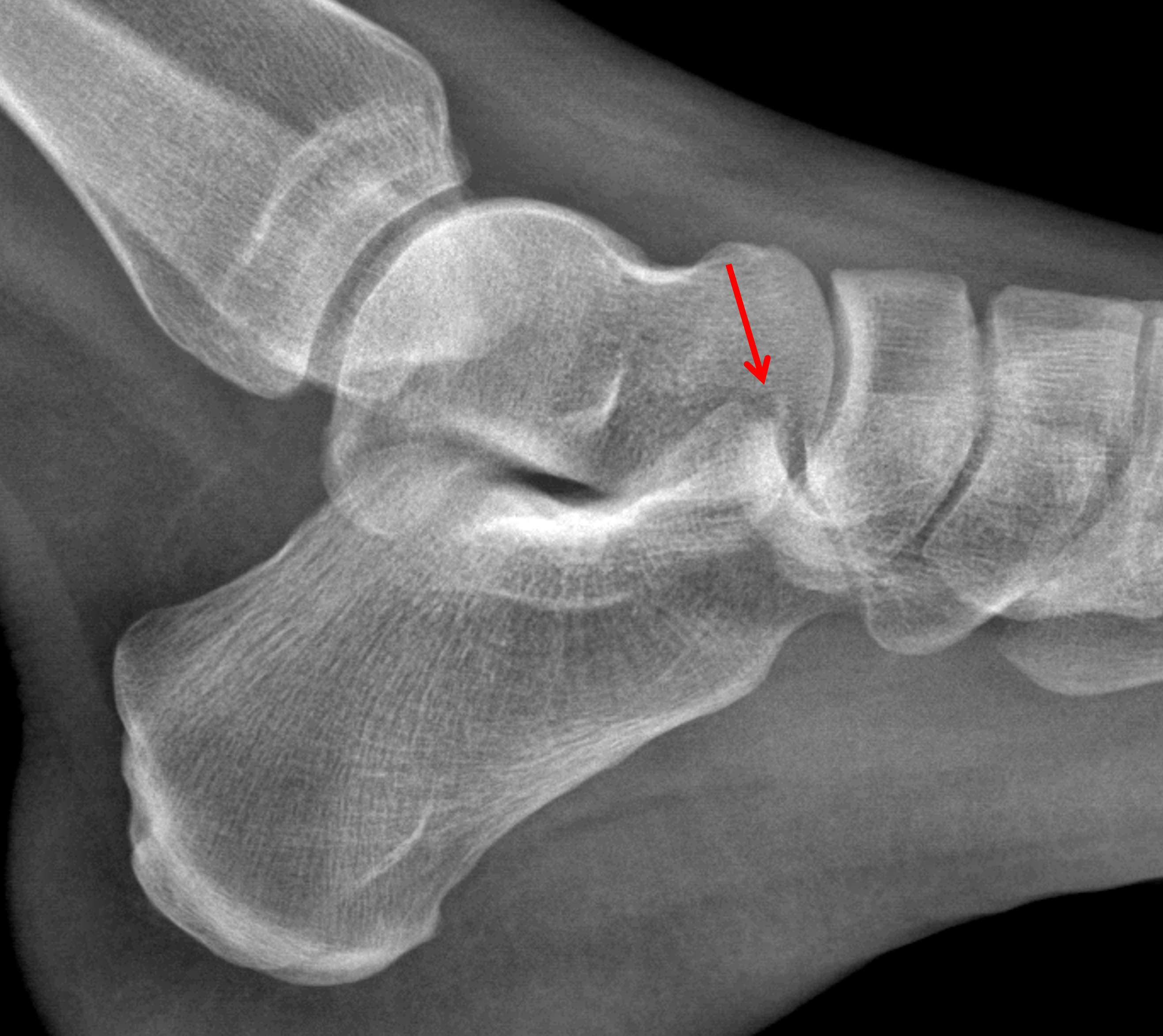 Acute mildly displaced fracture of the anterior process of the calcaneus (red arrow), which is best seen on the lateral view.
