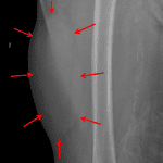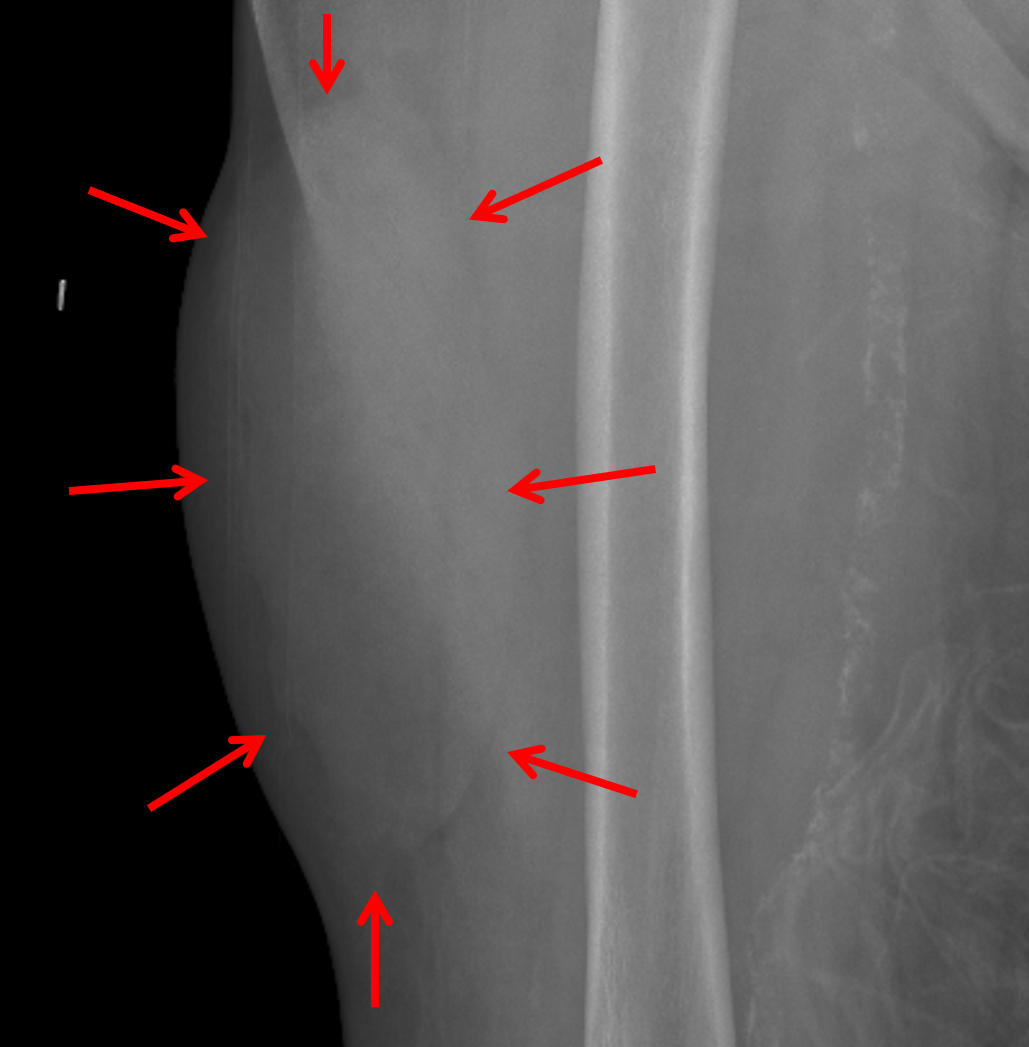 Large soft tissue mass in the lateral thigh adjacent to the mid femoral diaphysis, which likely represents a hematoma in the setting of trauma.