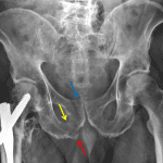 Sites of major muscle attachments on the anatomic pelvis. Red arrow: pubic tubercle avulsion fracture. Yellow arrow: inferior pubic ramus fracture (superior ramus fracture is not well seen on this view). Blue arrow: pubic body fracture.