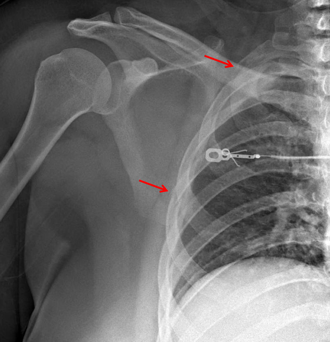 Sample ReportAcute mildly displaced fractures of the right lateral first and fourth ribs. No discernible right pneumothorax. Recommend dedicated chest imaging for further evaluation.