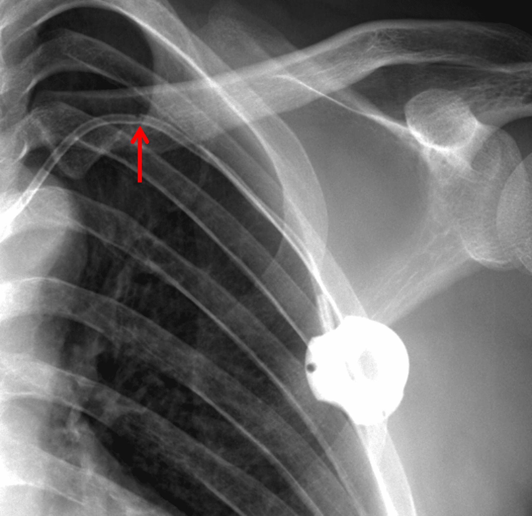 Partially imaged left subclavian approach port catheter with apparent fracture of the tubing overlying the clavicle.