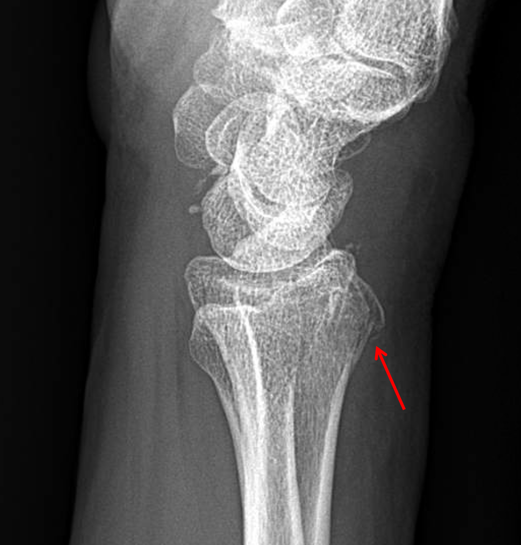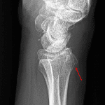 Sample ReportAcute minimally displaced dorsal distal radial fracture with possible intraarticular extension. Overlying soft tissue swelling.