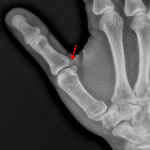 Sample ReportAge-indeterminate mildly distracted avulsion fracture from the ulnar base of the first proximal phalanx, consistent with ulnar collateral ligament avulsion (Gamekeeper’s thumb).