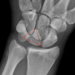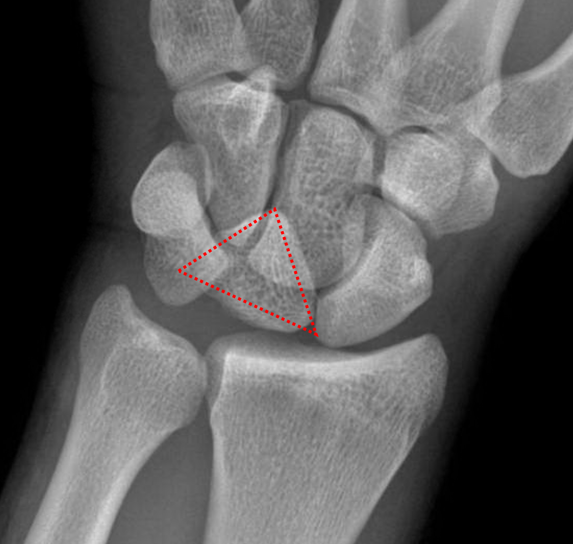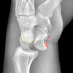 Greater (red line) and lesser (green line) carpal arcs. This is a normal wrist radiograph from a different patient. Lunate dislocation: triangular configuration of the lunate on the frontal view (red dotted lines) with the lunate abnormally overlapping the capitate and hamate, indicating capitolunate dislocation. Lunate dislocation: volar dislocation and tilt of the lunate (articular surface outline in red). Maintained radiocapitellar alignment with proximal migration of the capitate (articular surface outlined in yellow). Greater arc carpal dislocations in order of severity from left to right. Far left: normal. Left center: perilunate dislocation. Right center: midcarpal dislocation. Far right: lunate dislocation.