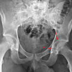 • Acute nondisplaced, mildly comminuted, transversely-oriented fracture of the left acetabulum