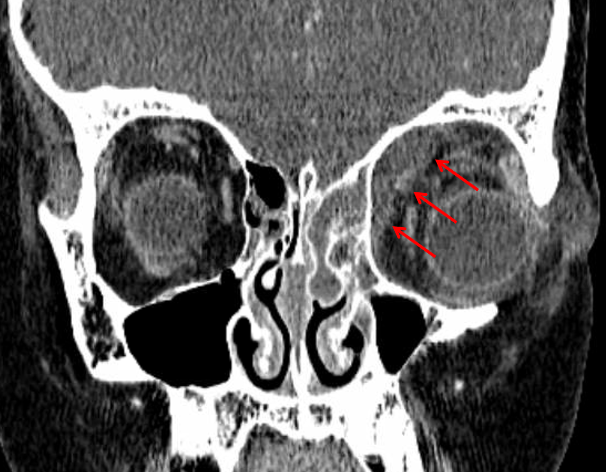 Sample ReportExtraconal subperiosteal abscess in the superomedial left orbit measuring up to 7 mm in thickness likely secondary to adjacent ethmoid sinusitis. Associated pre- and postseptal left orbital cellulitis as well as mild left proptosis.