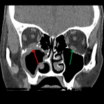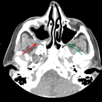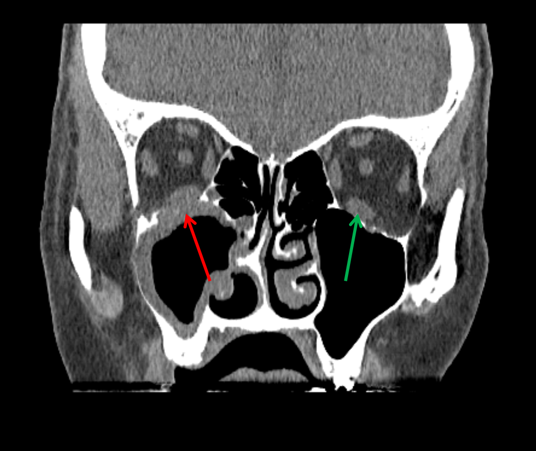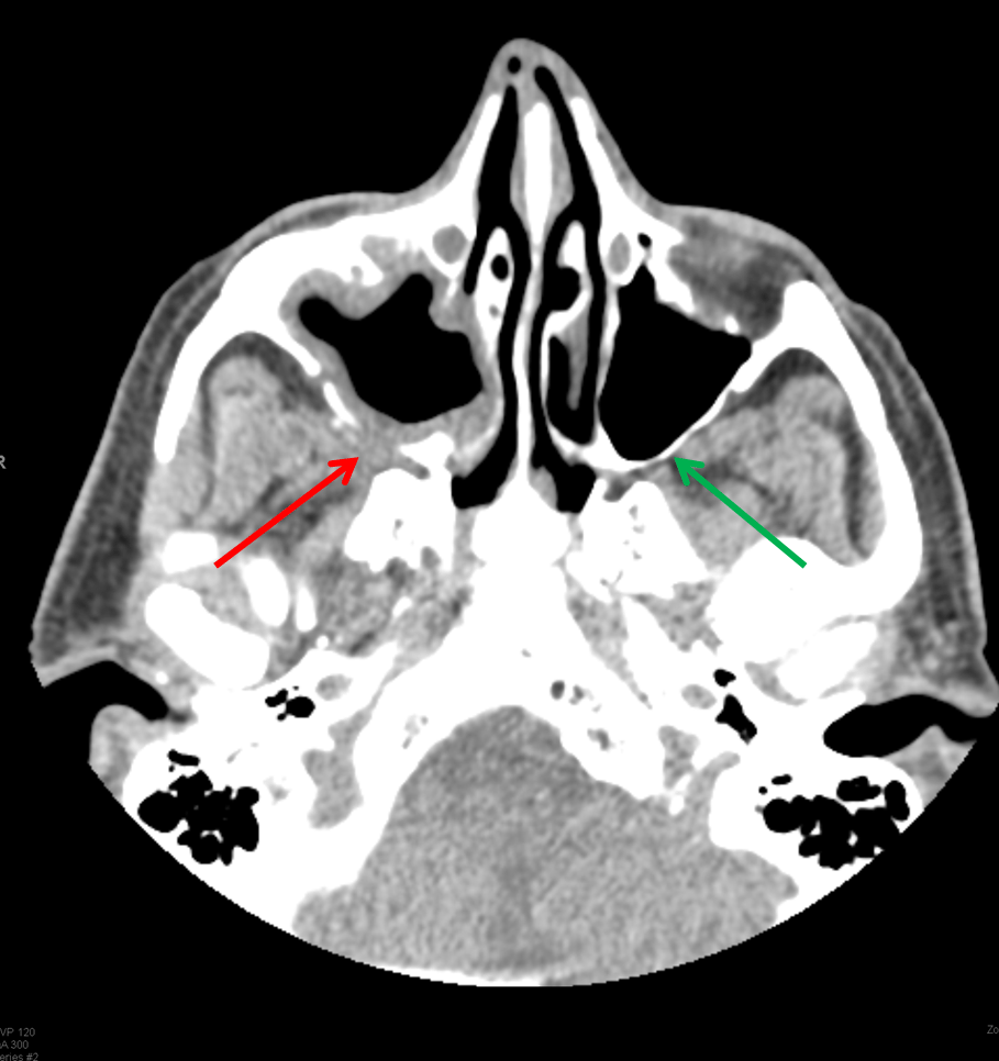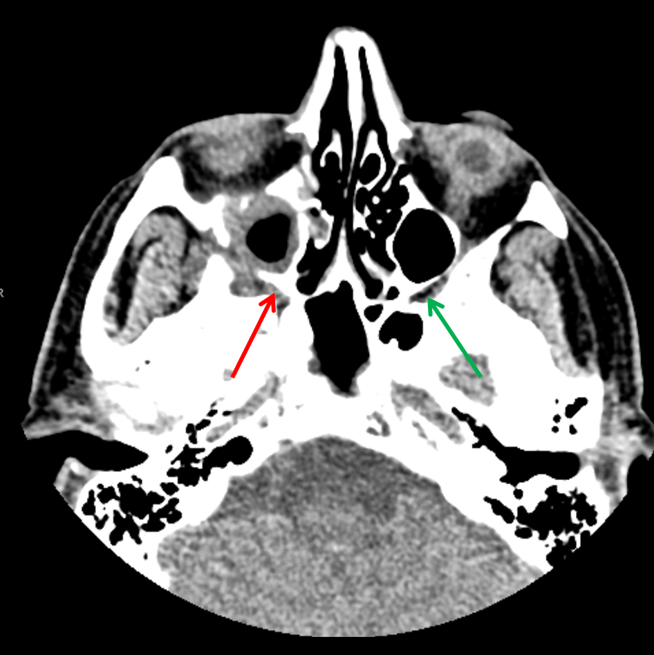 Red arrow: invasive disease through the posterior wall of the maxillary sinus into the retroantral fat. Green arrow: normal retroantral fat plane on the left for comparison. Red arrow: invasive disease through the orbital floor contacting the inferior rectus muscle, which is thickened. Green arrow: normal left inferior rectus muscle for comparison. Red arrow: abnormal soft tissue density in the pterygopalatine fossa representing invasive fungal sinusitis. Green arrow: normal fat in the left pterygopalatine fossa.
