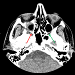 • Soft tissue extension superiorly into the right orbital floor contacting the inferior rectus muscle as well as posteriorly into the retroantral fat and pterygopalatine fossa