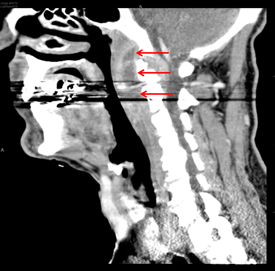 • Large peripherally enhancing retropharyngeal fluid collection extending from the skull base to the level of the C2-C3 disc space. Associated mass effect with partial effacement of the nasopharynx and oropharynx