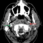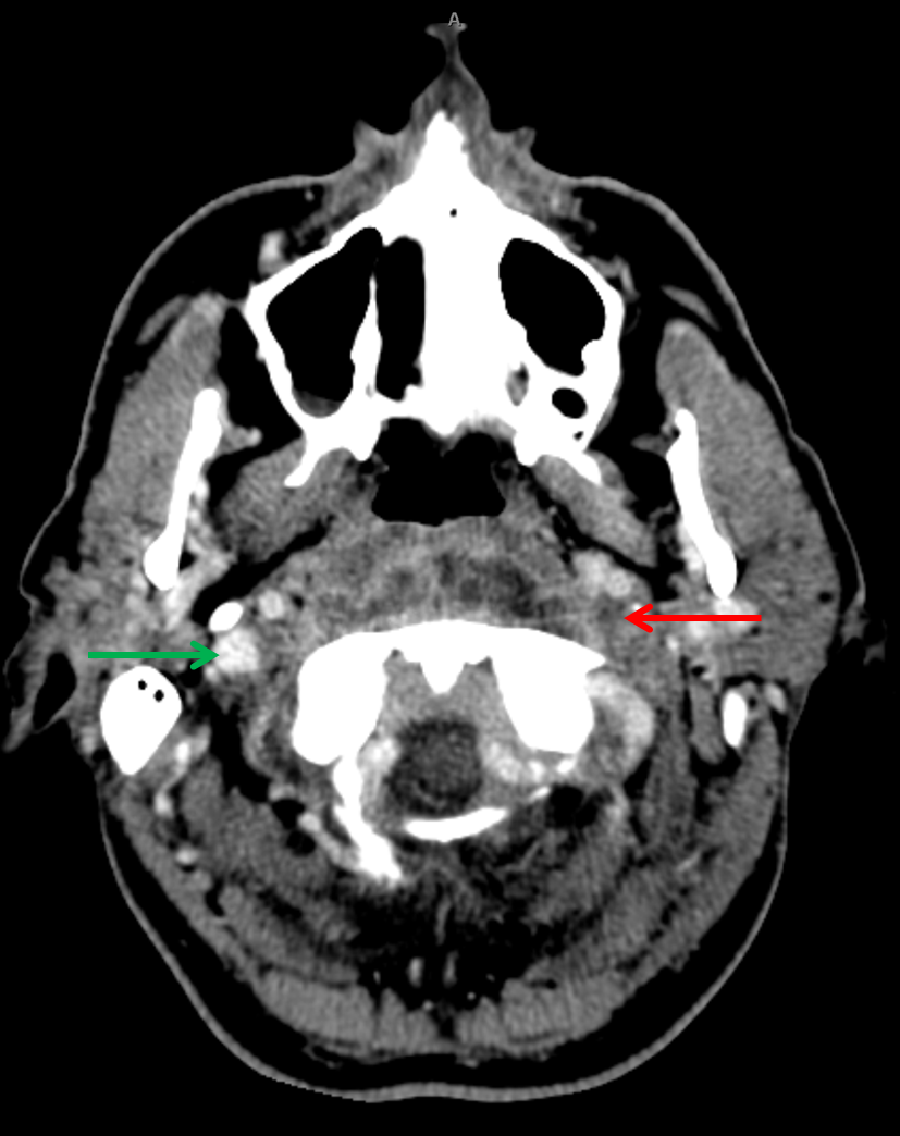 • Mass effect on the left internal jugular vein with occlusive thrombus in the left internal jugular vein extending cranially from the level of C1-C2 into the imaged portions of the left sigmoid and transverse sinsuses