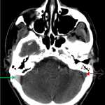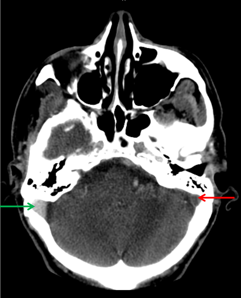 Red arrows: retropharyngeal abscess. Green arrow: normal opacified right internal jugular vein. Red arrow: thrombosed, unopacified left internal jugular vein. Green arrow: normal opacified right transverse sinus. Red arrow: thrombosed, unopacified left transverse sinus. Red arrow: possible small epidural collection.