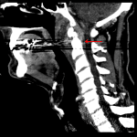 • Soft tissue thickening and possible thin peripherally enhancing fluid collection along the posterior margin of the C1 and C2 vertebral bodies