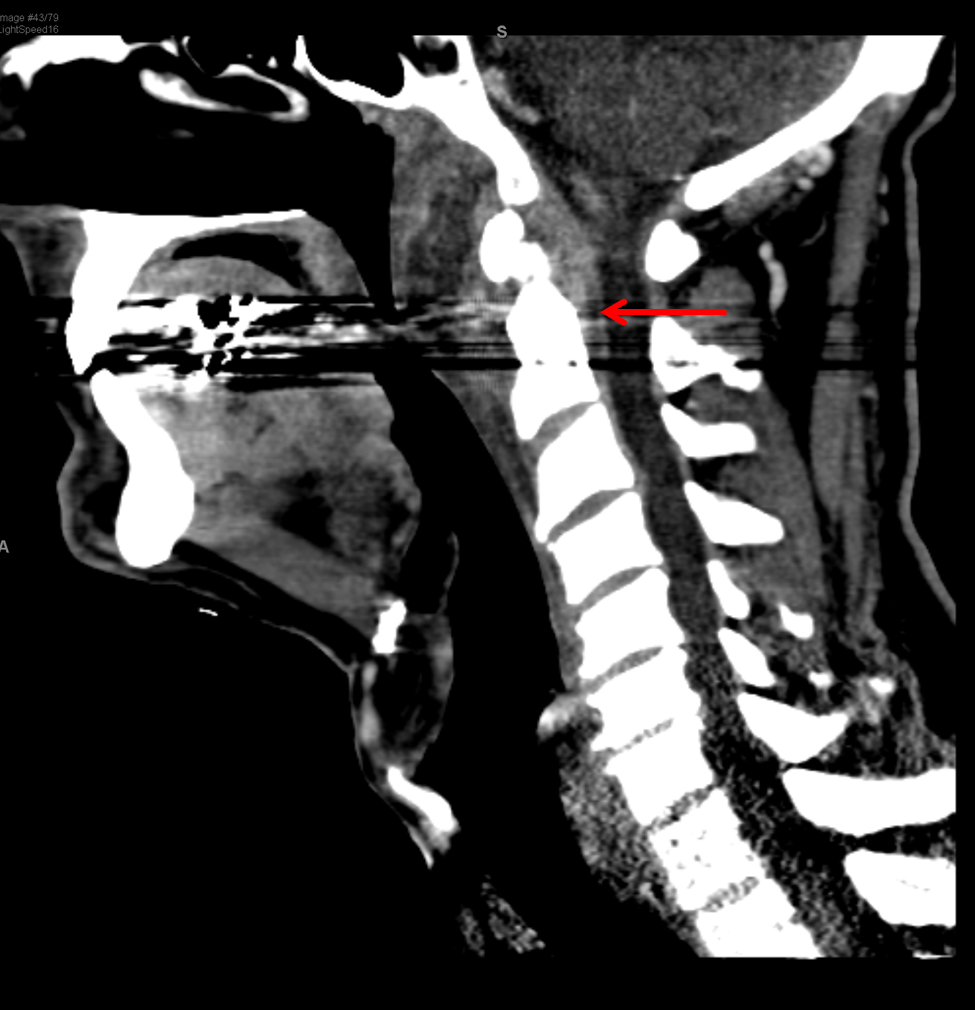 Soft tissue thickening and possible thin peripherally enhancing fluid collection in the ventral epidural space at the level of C1-C2, which is concerning for epidural abscess. Recommend C spine MRI with and without contrast for further assessment.