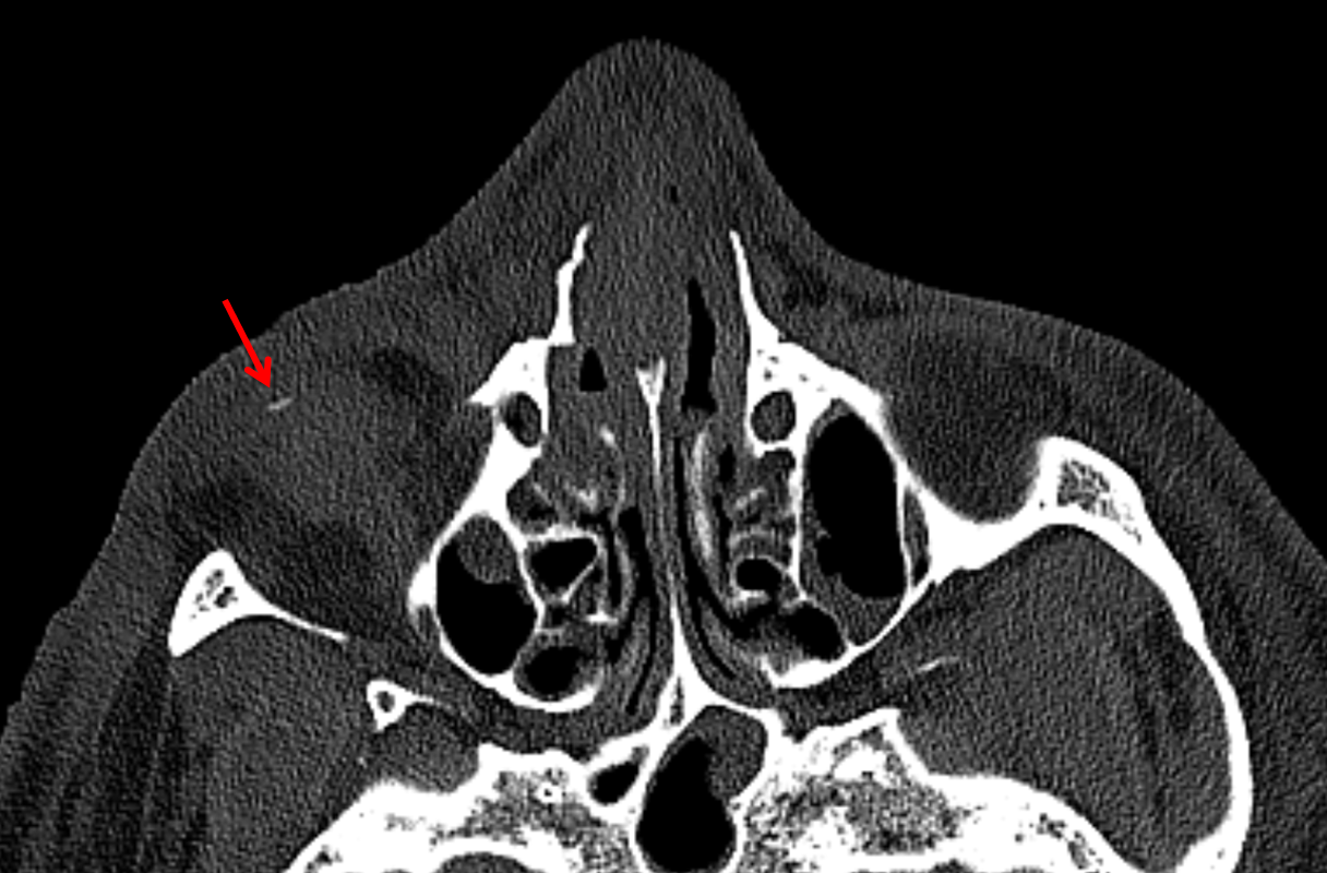 3 mm radiopaque foreign body along the anteroinferior margin of the right globe. Trace extraconal hemorrhage in the superomedial right orbit. No evidence of orbital wall fracture or proptosis. Globes are intact.